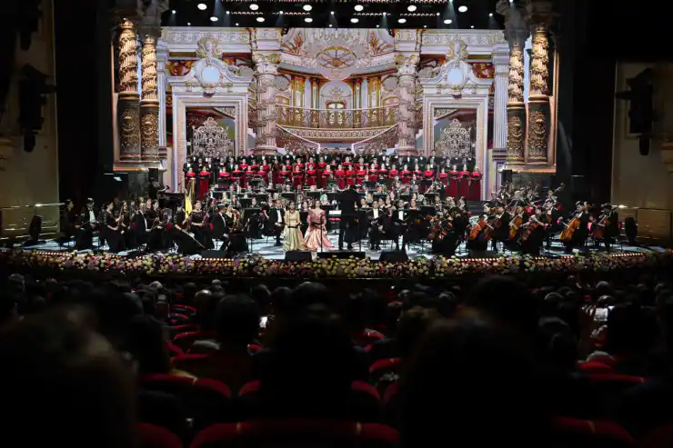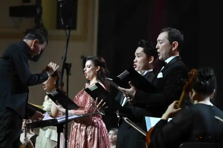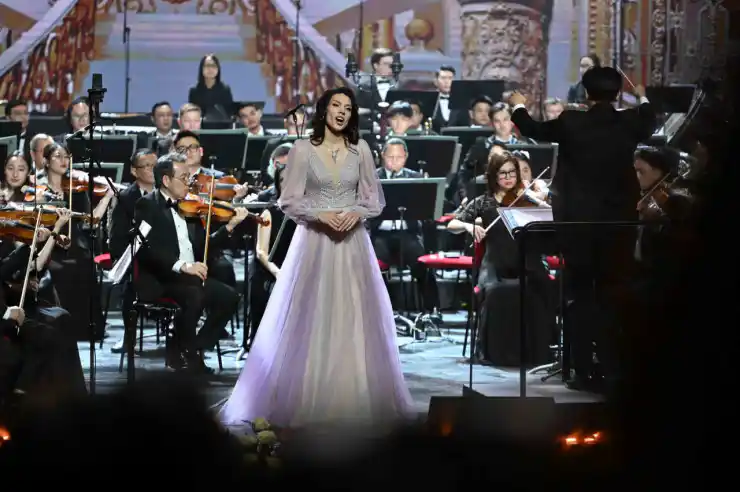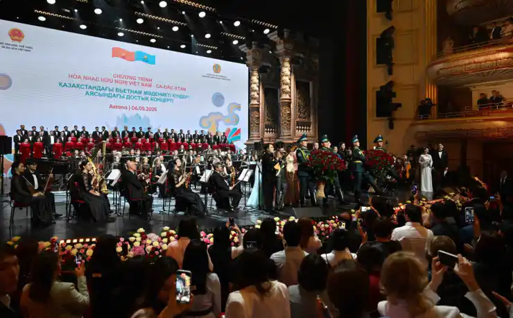 На сцене театра "Астана Опера" для почетных гостей и зрителей выступили Ханойский филармонический оркестр, симфонический оркестр театра "Астана Балет", хор Государственного театра оперы и балета "Астана Опера", а также известные артисты казахского и вьетнамского искусства.