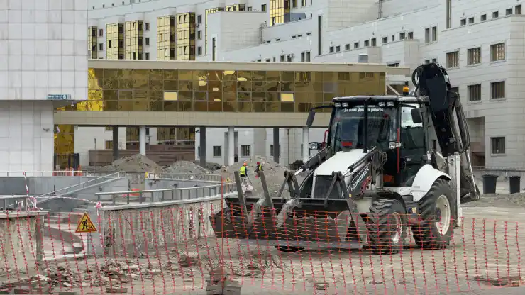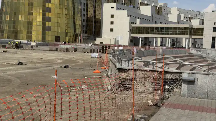 На втором этаже, в районе правительственных зданий, ведутся ремонтные работы: сняли верхний слой брусчатки и установили ограждения.