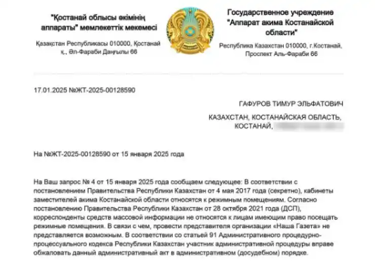 17 января исполняющая обязанности руководителя аппарата акима Костанайской области сообщила, что кабинеты заместителей акима считаются режимными помещениями.