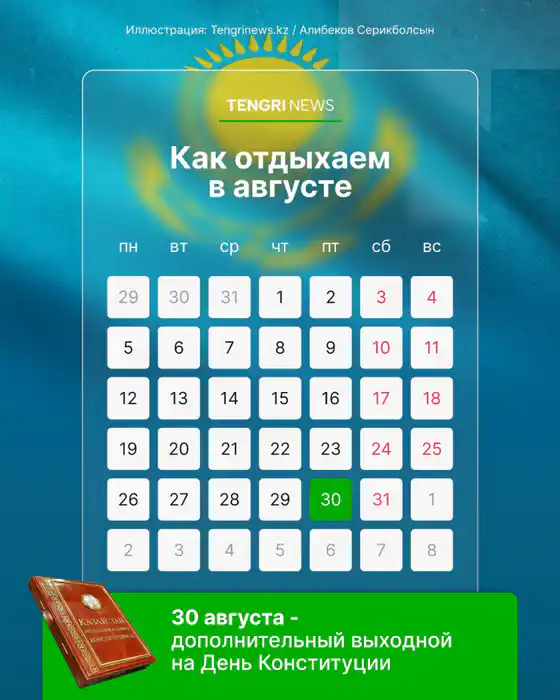 В августе 2024 года у граждан Казахстана с пятидневной рабочей неделей будет 10 выходных и 21 рабочий день. Подготовлен календарь на месяц, который поможет в планировании отдыха.