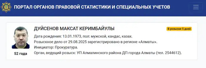 На портале органов правовой статистики и специальных учётов Генпрокуратуры появилась информация о розыске Максата Дуйсенова. Розыскное дело зарегистрировано по инициативе прокуратуры 29 августа в Алматы управлением полиции Алмалинского района.