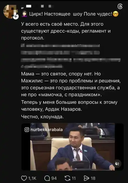 "Мажилис — это про проблемы и решения, это серьёзная государственная служба, а не про 'мамочка, с праздником'. Теперь у меня большие вопросы к этому человеку, Ардак Назаров. Честно, клоунада", — написал один из пользователей.