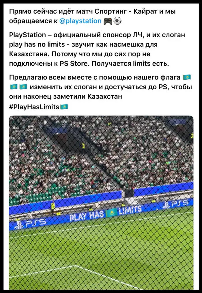 "Прямо сейчас идёт матч Спортинг – Кайрат, и мы обращаемся к @playstation. PlayStation - официальный спонсор ЛЧ, и их слоган play has no limits (игра без ограничений) звучит как насмешка для Казахстана. Ведь мы до сих пор не подключены к PS Store. Получается, limits (ограничения) всё-таки есть. Предлагаю всем вместе, с помощью нашего флага, изменить их слоган и достучаться до PlayStation, чтобы они наконец заметили Казахстан. #PlayHasLimits