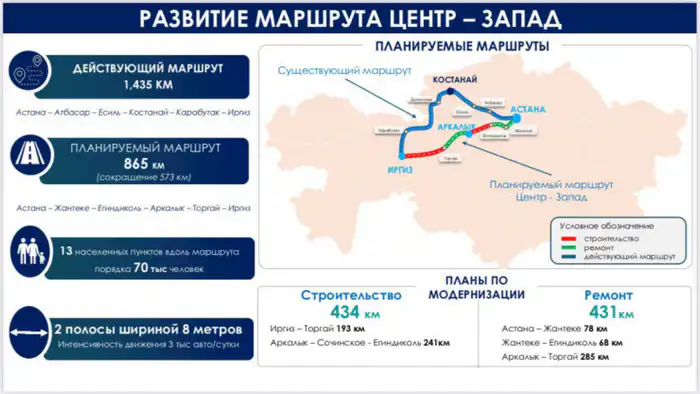 Новый маршрут через Жантеке, Егиндиколь, Аркалык и Торгай сократит путь до 865 километров, что на более чем 560 километров меньше текущего варианта.