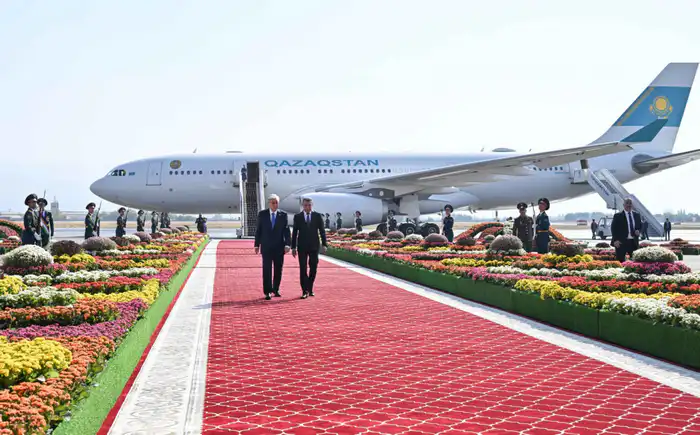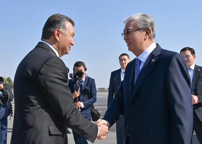 Президент Казахстана Касым-Жомарт Токаев приземлился в международном аэропорту Душанбе, где его встретил премьер-министр Таджикистана Кохир Расулзода.