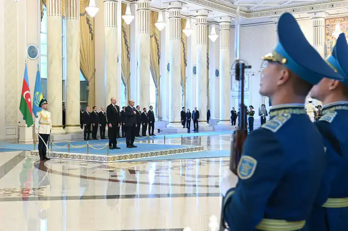 В Акорде состоялась официальная церемония встречи президента Азербайджана Ильхама Алиева, который прибыл в Казахстан с государственным визитом. Президенты Касым-Жомарт Токаев и Ильхам Алиев представили друг другу членов официальных делегаций.