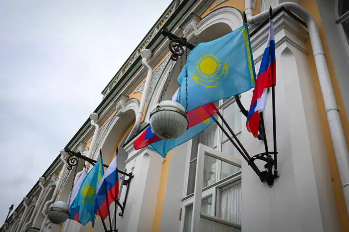 Президент Казахстана прибыл на автомобиле Aurus с казахстанскими номерами. У стен Кремля развевались флаги Казахстана и России.