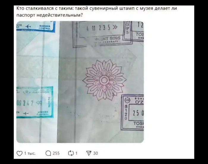 "Кто сталкивался с таким: такой сувенирный штамп из музея делает ли паспорт недействительным?" — написала автор поста.