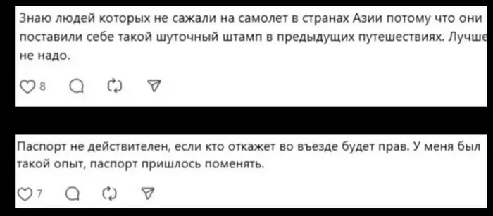 "Знаю людей, которых не сажали на самолет в странах Азии из-за таких шуточных штампов. Лучше вообще не рисковать", "Паспорт считается недействительным. Если откажут во въезде, будут правы. У меня был такой опыт, документ пришлось менять", — написали пользователи сети.