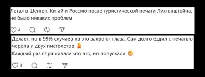 "В 99 случаях из 100 на это закрывают глаза. Я долго ездил с печатью черепа и двух пистолетов. Каждый раз спрашивали, что это, но пропускали", "Летал в Шенген, Китай и Россию после туристической печати Лихтенштейна. Ни разу не было проблем", — поделились комментаторы.