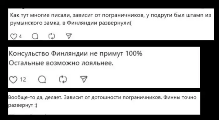 "Вообще-то да, паспорт становится проблемным. Но все зависит от дотошности пограничников. Финны точно развернут", "Как тут многие писали, все зависит от пограничников. У подруги был штамп из румынского замка, в Финляндии развернули", — поделились пользователи сети.