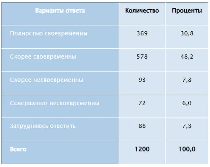"Фокус внимания граждан на общественно-политические преобразования подтверждает, что проводимые реформы воспринимаются как своевременные. В совокупности так ответили 79 процентов опрошенных, из них 48,2 процента считают реформы 'скорее своевременными', а 30,8% – 'полностью своевременными'," — считают исследователи.