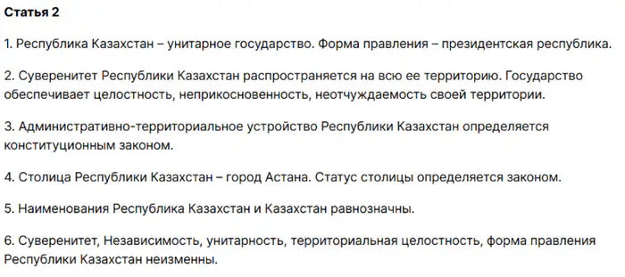 Норма об унитарности государства, целостности, неприкосновенности и неотчуждаемости территории Казахстана в новой Конституции остаётся неизменной.
