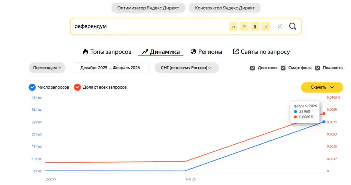 Если проанализировать запросы к Яндекс за 90 дней, то заметно следующее: с января, когда проект новой Конституции стал активно обсуждаться, резко вырос поиск по слову "референдум" из нашего региона. И перевалил за 30 тысяч обращений к концу февраля.