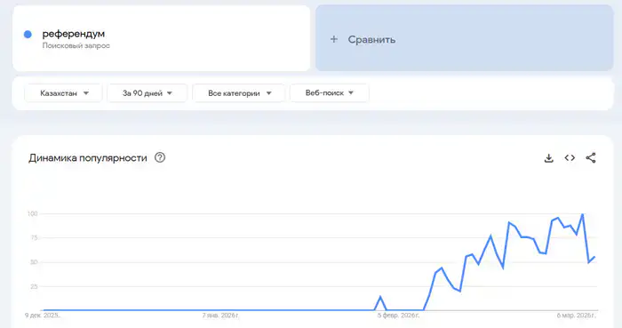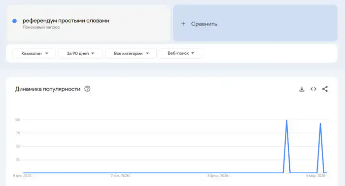 Такие же тренды показывает и Google. В этой поисковой системе за последние три месяца тоже заметен рост запросов по этому слову среди пользователей из Казахстана. Видно также, что кривая пошла вверх с 11 февраля, когда было объявлено о проведении всенародного голосования.
