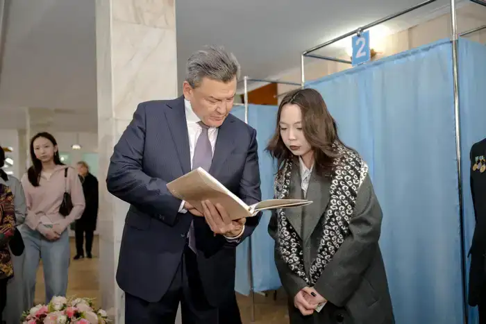 Аким также пообщался с жителями, пришедшими на участок. Среди них была Сабина Салыкова, которая впервые голосовала вместе со своими родителями. Глава региона поздравил её с этим важным событием и вручил памятный подарок — книгу о выдающемся казахском поэте и просветителе Магжане Жумабаеве.