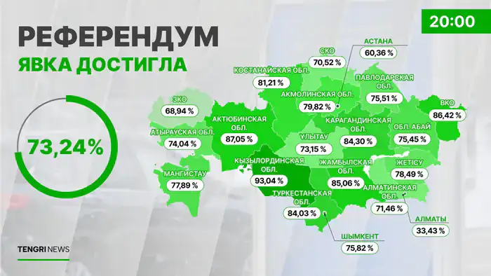 За весь период голосования с 07:00 до 20:00 бюллетени получили 9 126 850 казахстанцев, что составило 73,24 процента от числа граждан, имеющих право на голосование. Итоги о явке избирателей озвучил заместитель председателя Центральной комиссии референдума Мухтар Ерман.