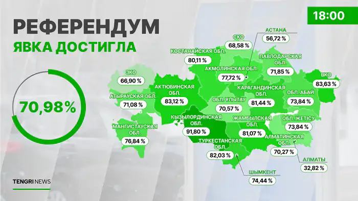 По состоянию на 18:00, явка избирателей на референдуме по новой Конституции Казахстана составила 70,98 процента. Это означает, что бюллетени получили 8 845 280 граждан, имеющих право голоса, согласно данным Центральной комиссии референдума.