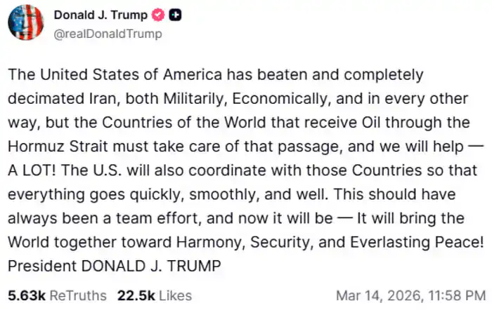 "США одержали победу над Ираном и полностью его разгромили как в военном, так и в экономическом отношении, а также во всех остальных сферах. Однако страны мира, которые получают нефть через Ормузский пролив, должны позаботиться об этом проходе, и мы окажем помощь — большую помощь!"